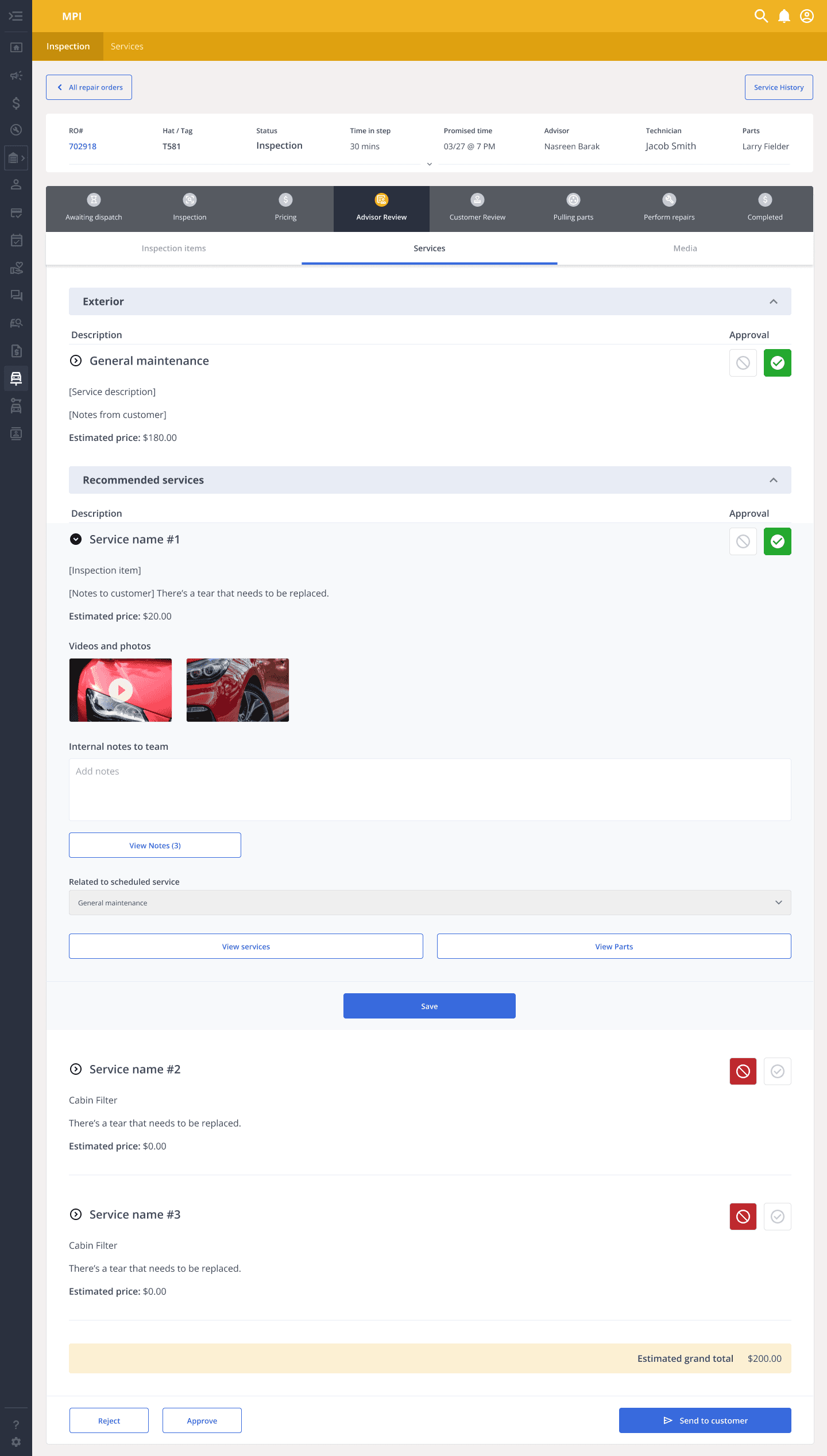 Recommendations are displayed with clearer descriptions, pricing, and part associations. Advisors can instantly understand technician findings without digging through data-heavy tables.